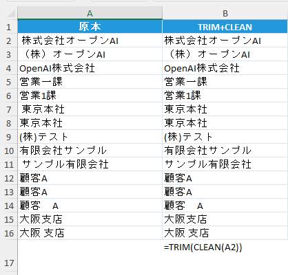 たとえば、前後の空白、見えない文字、全角半角の混在、会社名の書き方の違いがあるだけで、COUNTIFやVLOOKUP、ピボットテーブルの結果がずれます。