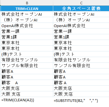 • B列:空白・不要文字除去