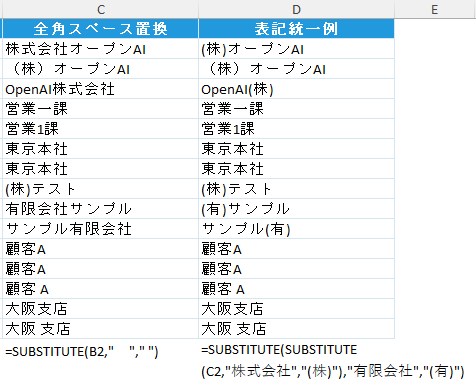 =SUBSTITUTE(SUBSTITUTE(B2,"株式会社","(株)"),"営業一課","営業1課")