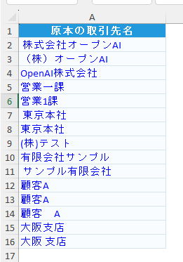 件数が数百件程度なら、整形後の列で並べ替えをして、似た表記をまとめて確認した方が早いこともあります。